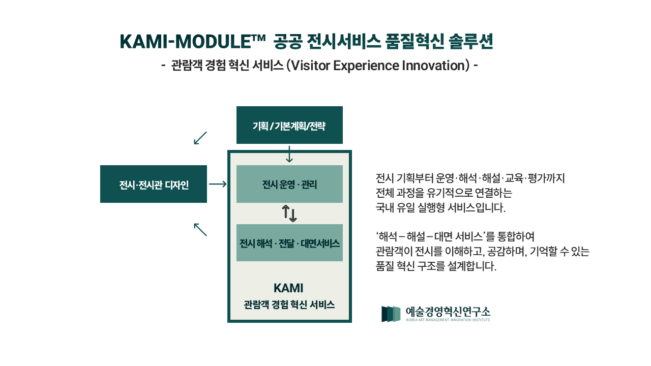 이 체계를 통해 KAMI는 단순한 해설이나 운영을 넘어, 관람객 여정 설계, 운영자 교육, 서비스 품질 진단까지 아우르는 실행 중심의 전략적 프레임워크를 제공합니다.